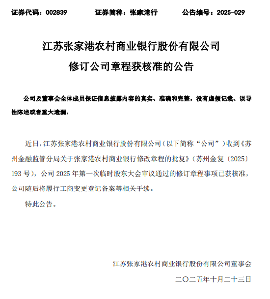 10月23日金融一线消息,江苏张家港农村商业银行今日发布公告称,近日该行收到《苏州金融监管分局关于张家港农村商业银行修改章程的批复》(苏州金复〔2025〕193 号),公司 2025 年第一次临时股东大会审议通过的修订章程事项已获核准,公司随后将履行工商变更登记备案等相关手续。