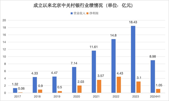 时间周期拉长来看,从成立之初的2017年到2023年末,中关村银行分别实现营业收入1.32亿元、4.33亿元、4.47亿元、7.14亿元、11.61亿元、14.8亿元和18.43亿元,期间增速分别为228.03%、3.23%、59.73%、62.61%、27.48%、24.53%;同期净利润分别为0.06亿元、0.9亿元、0.5亿元、2.03亿元、3.57亿元、4.43亿元和3.1亿元,同比增幅分别约为1400%、-44.44%、306%、75.86%、24.09%、-30.02%。