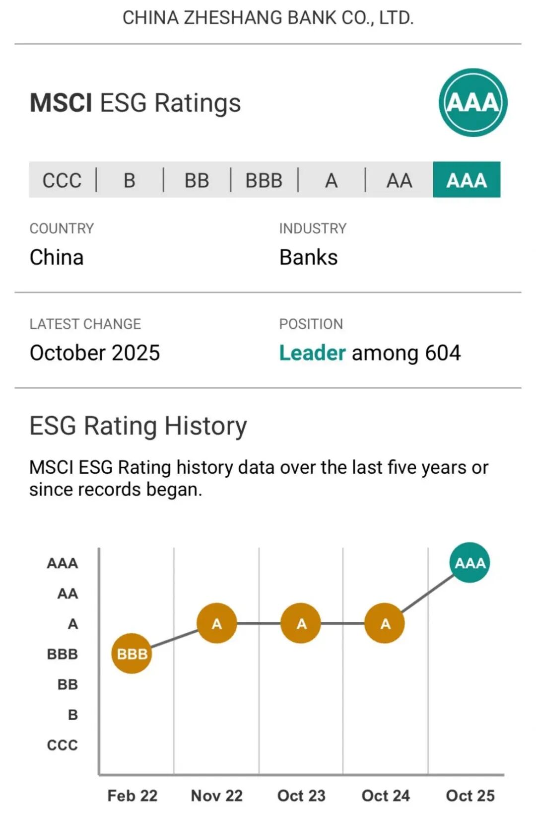 近日,国际权威评级机构明晟(MSCI)发布2025年度浙商银行ESG评级结果。浙商银行ESG评级跃升至全球最佳等级“AAA”级,在同业中处于领先(leader)水平。