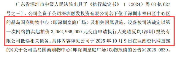 法院裁定,深圳皇庭广场及相关附属设施、设备,以30.53亿元交由光曜夏岚(深圳)投资有限公司抵债。