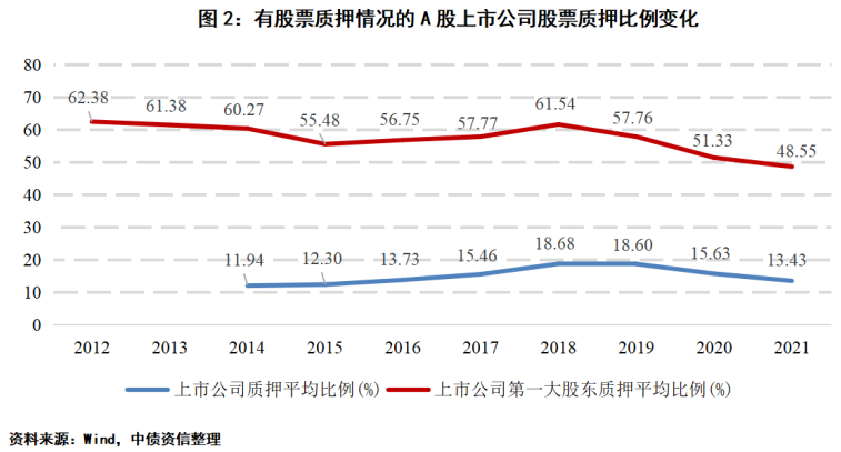 图2展示了A股存在股票质押情况的上市公司的股东质押比例的历史变化情况。在2018年之前,有股票质押的上市公司的股东平均质押比例逐年增加,从2014年的11.94%增长连续增长至2018年末的18.68%,随后开始下降,在2021年末,有股票质押的上市公司的股东平均质押比例为13.43%。有股票质押的上市公司的第一大股东的平均质押比例,在2018年之前维持在60%左右,从2019年开始也逐年下降,到2021年末第一大股东的平均股票质押比例为48.55%。