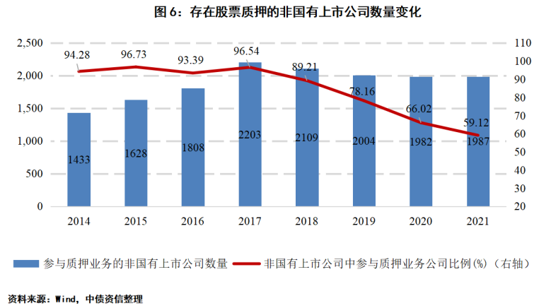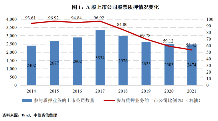 从图1可以看到,在2018年之前,每年参与股票质押的上市公司数量逐年增加,占比基本稳定在90%以上。从2018年开始,有股票质押的A股上市公司数量和比例逐年下降。2021年,有2474家A股上市公司存在股票质押的情况,占当年全部A股上市公司数量的约53%,分别较2017年高点时的3334家和96.94%,有明显幅度的下降。