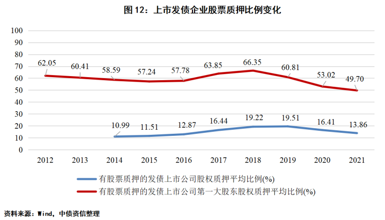 继续讨论股东质押上市发债企业的情况。图10中,每年发行信用债的上市公司数量在2016年之前逐年增加,并在2016年末达到峰值596家,随后逐年下降,在2021年末有433家上市公司发行了信用债。在图11中可以看到,在2017年之前,有股权质押的发债上市公司比例超过90%,从2018年开始这一比例逐年下降,并在2021年末降至49%,与市场整体趋势一致。受质押新规等政策影响,有股权质押的发债上市公司的平均质押比例和第一大股东平均质押比例(图12)也从2018-2019年的高位逐渐回落,与市场平均水平的变化基本相同。