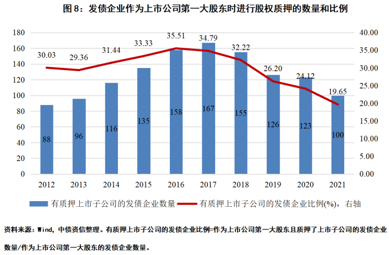 对信用风险直接影响较大的是发债企业质押了上市子公司的股权。高比例的股权质押直接反映了发债企业的再融资风险。如果一家发债企业发债高比例质押了上市公司的股权,一方面企业后续就难以再通过股权质押的方式获得进一步融资,另一方面如果质押比例过高,那么很可能是企业已经穷尽其余融资方式后的被动选择,从侧面证明了企业再融资能力有限。例如,三胞集团为支持其巨额的并购业务,大部分融资来自于股权质押,导致2017年时三胞集团质押了南京新百股权的97.02%、宏图高科股权的99.97%、世鼎香港股权的100%。然而,重金收购的资产基本没有回血能力,有的甚至在加速吸血。后来金融机构逐渐收紧对三胞集团的资金支持,银行抽离资金超过110亿元,最终三胞集团流动性趋于枯竭,发生债券违约。