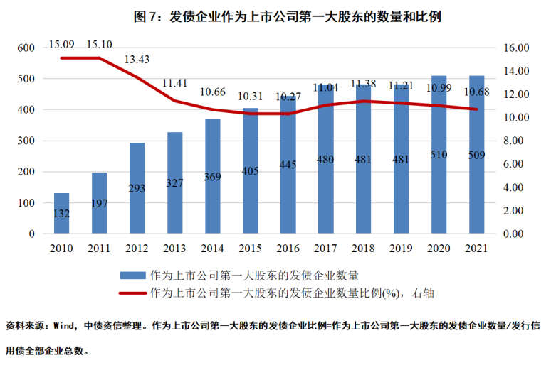 对发债企业来说,不论发债企业质押上市子公司股权或是股东质押发债上市子公司股权,其可能导致的信用风险点主要都是再融资风险和控制权变更风险,具体表现会略有差异。对于再融资风险,若发债企业质押上市子公司,其一可能说明发债企业通过其他融资渠道的融资空间有限,二是股价下跌至警戒线后,需提前偿还或者补质押;若上市发债企业股权被大股东质押,则说明大股东后续的进一步支持能力有限。对于控制权变更风险,则是当股价下跌至平仓线后,出质企业有失去上市子公司控制权的风险,以及被质押企业有被动变更大股东/实际控制人的隐患。