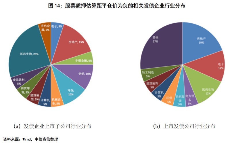 对于上市发债公司,如图14(b)所示,股权质押估算平仓价为负的上市发债公司有41家,距平仓价跌幅在-29%至0%之间,主要集中在房地产和电子行业。