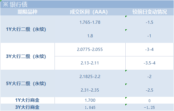 今日银行债成交热情回暖,成交收益开盘后震荡下行,整体呈下行趋势。截止收盘,二级短端多成交在估值-1.5-2bp附近,成交收益率较昨日下行-1-2bp左右;二级长端多成交在估值-3-3.5bp附近,成交收益率较昨日下行2.5-3bp左右。永续短端多成交在估值-1-1.5bp附近,成交收益率较昨日下行0.5bp左右;永续长端多成交在估值-3.5-4bp附近,成交收益率较昨日下行3-3.5bp左右。商金短端多成交在估值附近,成交收益率较昨日变化不大;商金长端多成交在估值-1-1.5bp附近,成交收益率较昨日下行1-1.5bp左右。5Y大行二级尾盘落在2.1825附近,5Y大行永续尾盘落在2.31附近;3.04Y大行二级落在2.055附近,2.96Y大行永续落在2.11附近;3Y大行商金落在1.845附近。今日二级短端以基金、银行和券商为主要买盘,二级长端以基金、券商和银行为主要买盘;永续短端以基金、券商资管和理财子为主要买盘,永续长端以基金、理财子和券商资管为主要买盘;商金债买盘以银行、基金和理财子为主要买盘。