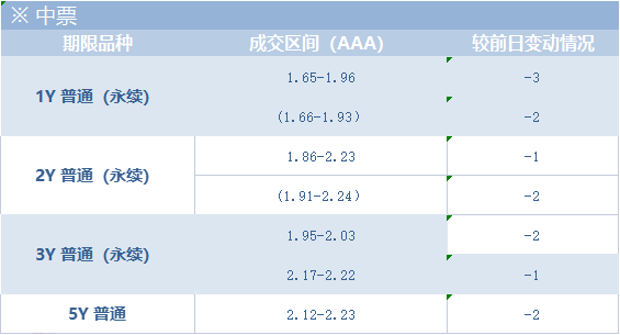节后第一天中票成交活跃,机构开盘先较谨慎后在市场逐渐下行的带动下愈发活跃,日内下行约3-4bp,尾盘稍有上行1bp。年内成交活跃,基金和理财参与买盘,多关注收益在1.7+的央国企名字。1-3Y期限成交活跃,基金是主要买盘,理财和券商资管参与买盘,2Y以上期限收益高在1.9的的国企好名字收到市场关注,例2.36Y北京国资在1.94(估值-0.9)位置成交。3-5年成交活跃,理财和基金参与成交,4年好名字在2.12-2.16区间成交;更长期限,成交相对较少,银行和保险买盘关注一些绝对好名字,今天的超AAA在2.42/2.41/2.4位置成交,另外10年华润名字在2.48位置成交多笔。永续中票方面交投活跃,好名字国企主体成交在估值附近。