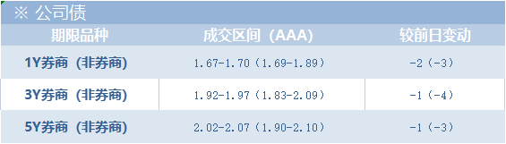 1-3y方面,券商方面成交在估值-1bp到估值-2bp附近,买盘主要为基金;非券商方面多关注公募可质押,成交主要在估值上下2bp附近,买盘主要为基金和券商。