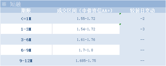 今日资金市场均衡偏宽松,短融市场交投火热,年内收益下行3bp,跨年债券收益与节前基本相同。月内AAA成交在1.55-1.72,买盘主要为基金和券商资管,5D中车集成交在1.59,6D东航成交在1.6,11D-12D电网成交在1.6-1.61,15D张江集和15D浙交投均成交在1.64,8D大唐资本成交在1.72;四季度AAA成交在1.54-1.72,基金和银行为买盘主力,82D中车成交在1.54,71D伊利实业成交在1.58,28D厦翔业成交在1.63,71D和82D杭州钢铁均成交在1.63,49D上海大众成交在1.68,74D南通沿海成交在1.72; 跨年一季度AAA成交在1.61-1.76,基金和银行为配置主力,120D上海机场成交在1.61,120D杭金投成交在1.69,159D锡交通和148D国联均成交在1.72;更长期限AAA成交在1.7-1.8,基金和理财持续配置,211D国家能源在1.7被哄抢,252D青岛啤酒成交在1.74,250D昆山创业成交在1.76,243D中粮科技成交在1.8。