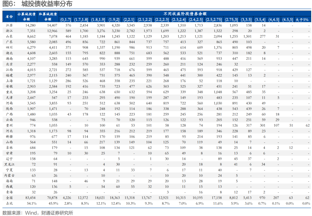具体来看,城投债收益率主要分布在1.7%~2.6%区间,成本高于2.6%的债券规模23,990.5亿元,占比16.17%。