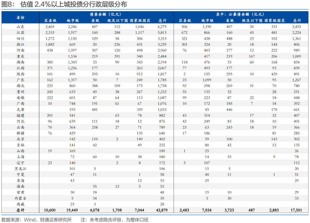 ①省份层面,山东、江苏、四川、浙江、河南、重庆、湖南、江西等省份2.4%以上债券存续规模较高。更具体来看,山东、江苏、四川主要存在于区县级和地市级主体,浙江主要是区县级主体,重庆散布于各辖区,河南、湖南、江西区县发债较少,主要集中于地市级。