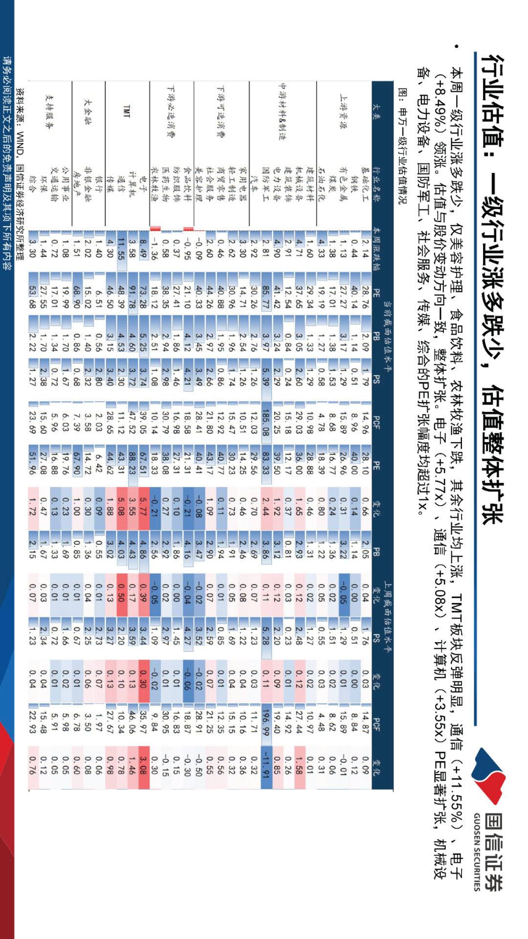 本周一级行业涨多跌少,估值整体扩张。仅美容护理、食品饮料、农林牧渔下跌,其余行业均上涨,TMT板块反弹明显,通信(+11.55%)、电子(+8.49%)领涨。估值与股价变动方向一致,整体扩张。电子(+5.77x)、通信(+5.08x)、计算机(+3.55x)PE显著扩张,机械设备、电力设备、国防军工、社会服务、传媒、综合的PE扩张幅度均超过1x。