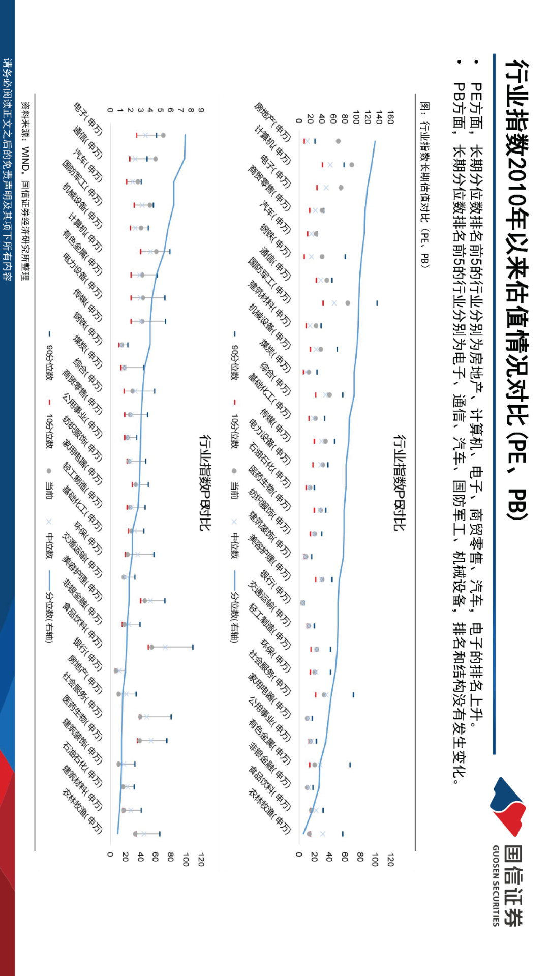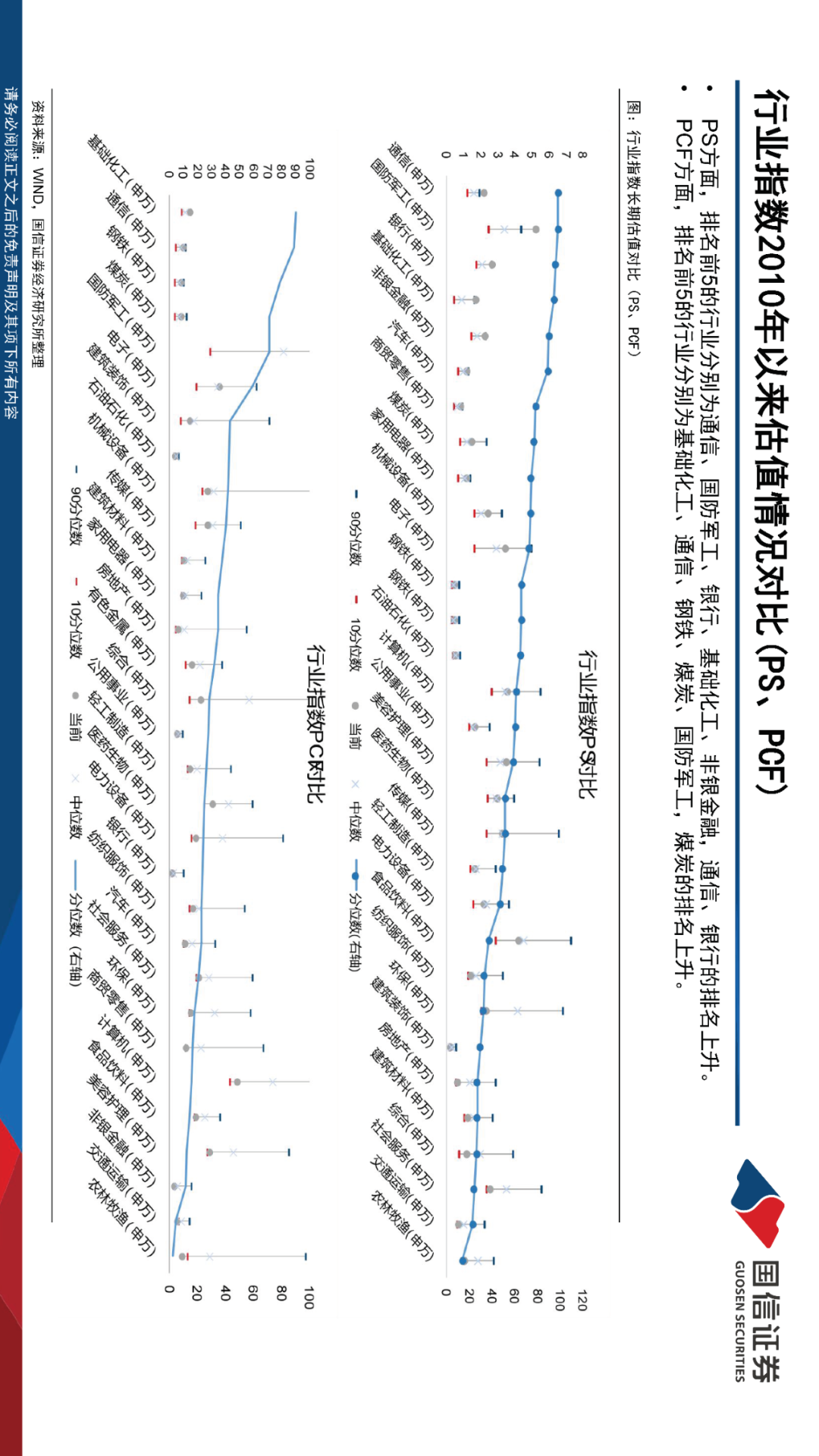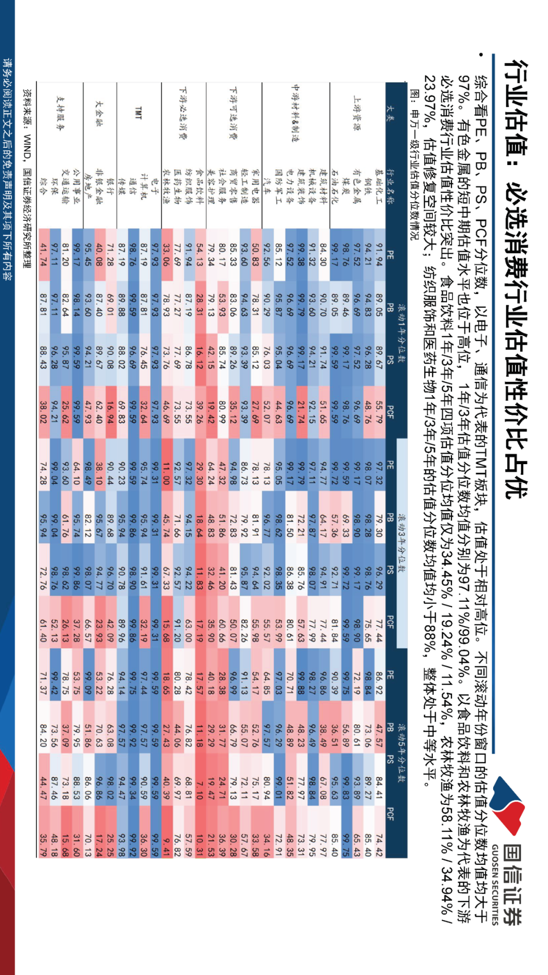 必选消费行业估值性价比占优。综合看PE、PB、PS、PCF分位数,以电子、通信为代表的TMT板块,估值处于相对高位。不同滚动年份窗口的估值分位数均值均大于97%。有色金属的短中期估值水平也位于高位, 1年/3年估值分位数均值分别为97.11%/99.04%。以食品饮料和农林牧渔为代表的下游必选消费行业估值性价比突出。食品饮料1年/3年/5年四项估值分位均值仅为34.45% / 19.24% / 11.54%,农林牧渔为58.11% / 34.94% / 23.97%,估值修复空间较大;纺织服饰和医药生物1年/3年/5年的估值分位数均值均小于88%,整体处于中等水平。