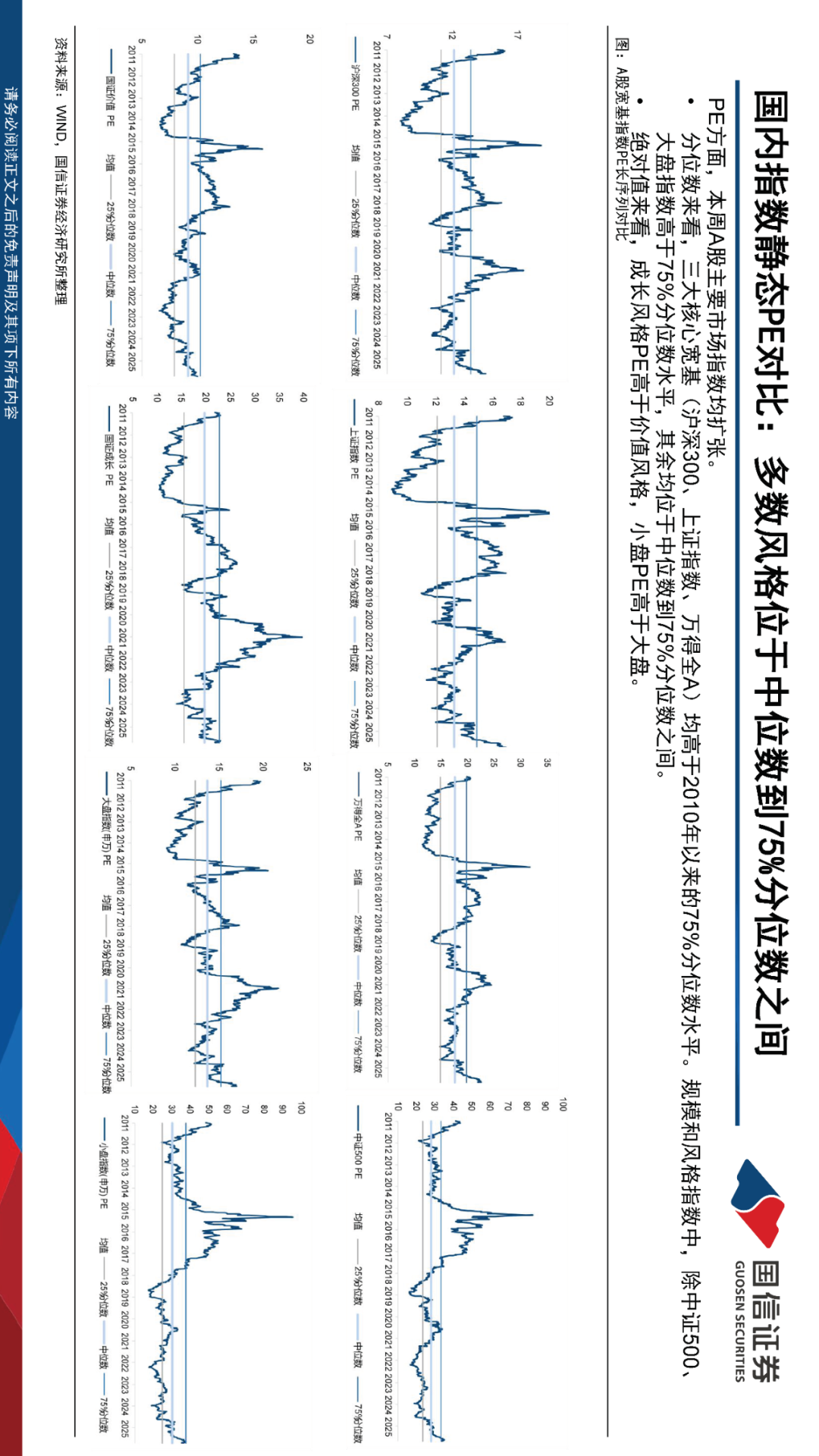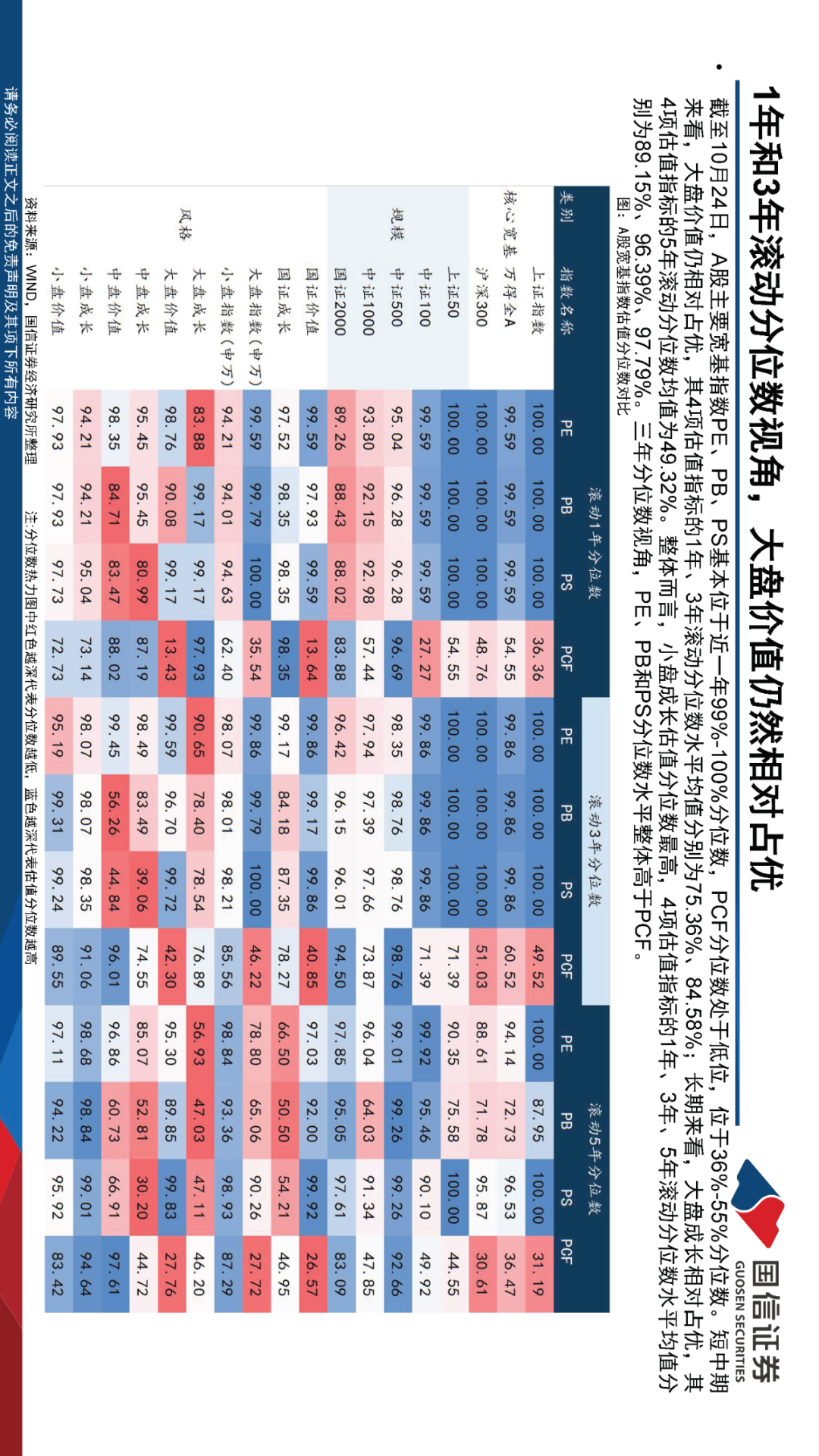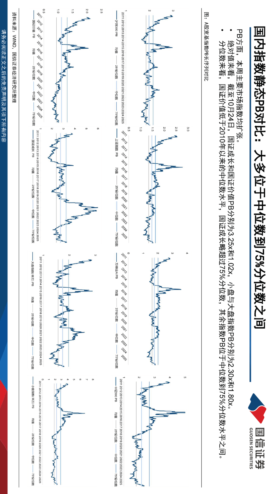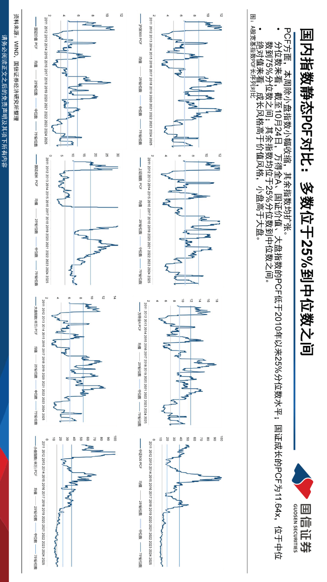 近一周(2025.10.20-2025.10.24),A股核心宽基集体反弹,估值修复。具体来看,规模上,国证2000(+3.58%)领涨,其余规模指数涨幅均超过2.5%,分化不明显;风格上,大盘成长(+5.08%)领涨,成长风格明显占优。估值均扩张,中证2000(+4.08x)PE扩张最显著,此外,中证1000、国证2000、小盘指数PE扩张幅度均超过1x。截至10月24日,A股主要宽基指数PE、PB、PS基本位于近一年99%-100%分位数,PCF分位数处于低位,位于36%-55%分位数。短中期来看,大盘价值仍相对占优,其4项估值指标的1年、3年滚动分位数水平均值分别为75.36%、84.58%;长期来看,大盘成长相对占优,其4项估值指标的5年滚动分位数均值为49.32%。整体而言,小盘成长估值分位数最高,4项估值指标的1年、3年、5年滚动分位数水平均值分别为89.15%、96.39%、97.79%。三年分位数视角,PE、PB和PS分位数水平整体高于PCF。