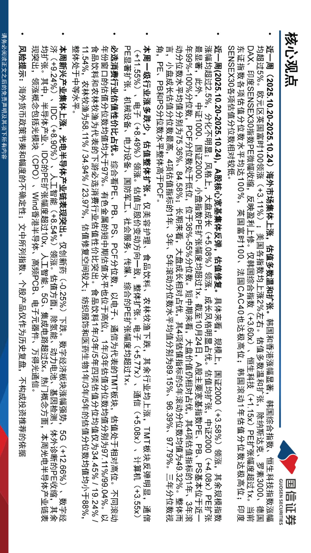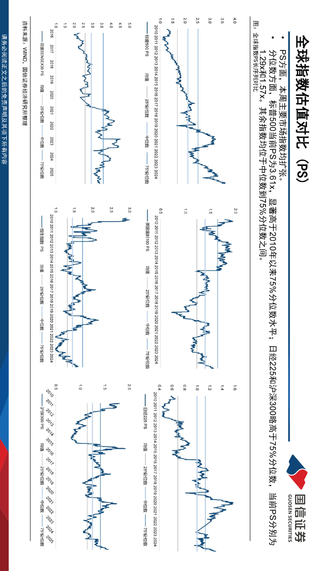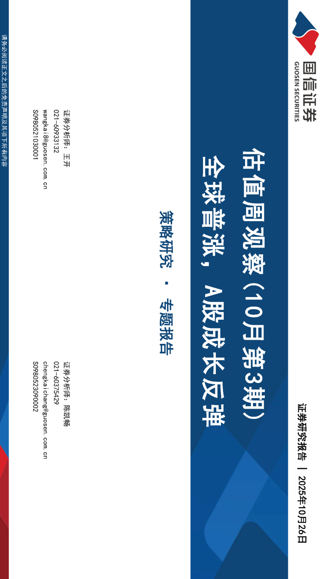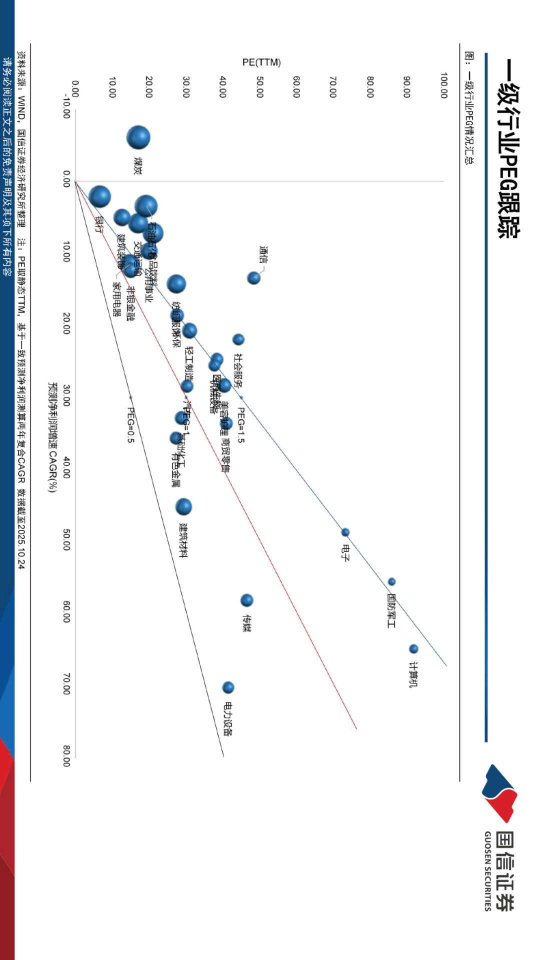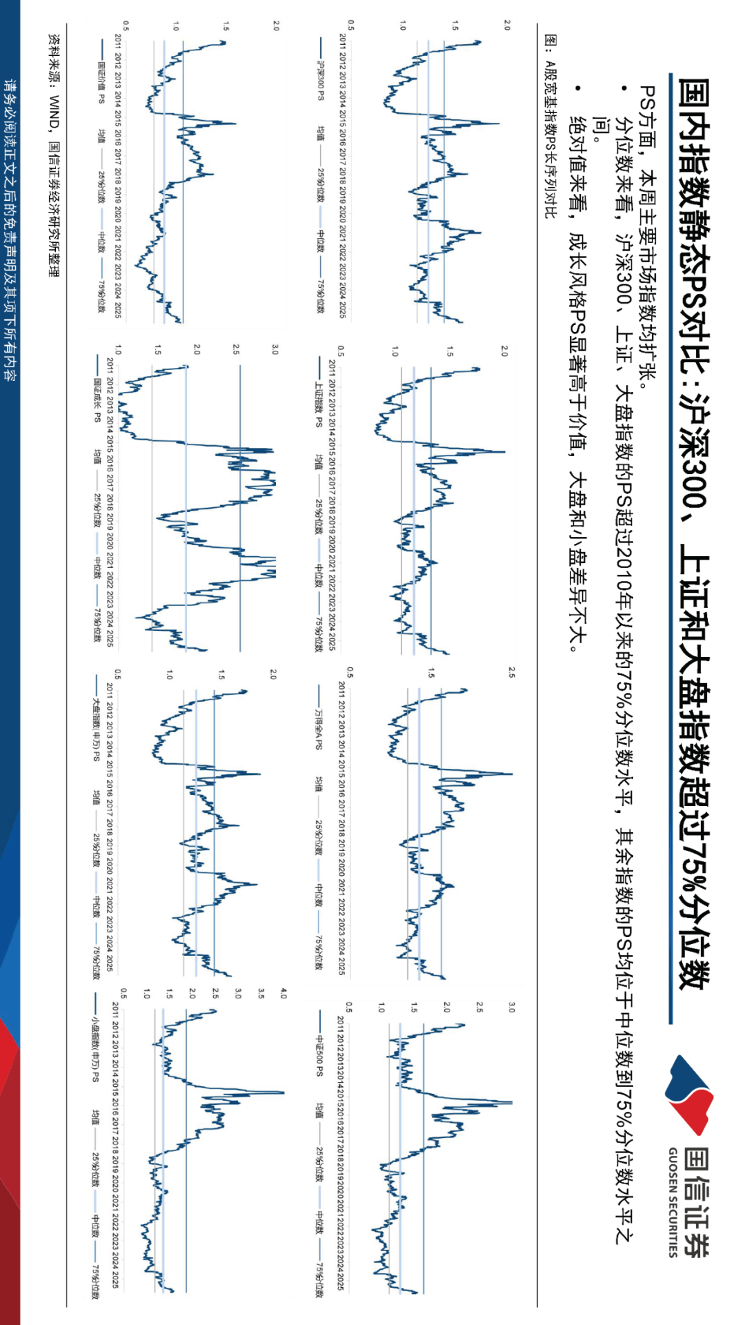 近一周(2025.10.20-2025.10.24),A股核心宽基集体反弹,估值修复。具体来看,规模上,国证2000(+3.58%)领涨,其余规模指数涨幅均超过2.5%,分化不明显;风格上,大盘成长(+5.08%)领涨,成长风格明显占优。估值均扩张,中证2000(+4.08x)PE扩张最显著,此外,中证1000、国证2000、小盘指数PE扩张幅度均超过1x。截至10月24日,A股主要宽基指数PE、PB、PS基本位于近一年99%-100%分位数,PCF分位数处于低位,位于36%-55%分位数。短中期来看,大盘价值仍相对占优,其4项估值指标的1年、3年滚动分位数水平均值分别为75.36%、84.58%;长期来看,大盘成长相对占优,其4项估值指标的5年滚动分位数均值为49.32%。整体而言,小盘成长估值分位数最高,4项估值指标的1年、3年、5年滚动分位数水平均值分别为89.15%、96.39%、97.79%。三年分位数视角,PE、PB和PS分位数水平整体高于PCF。