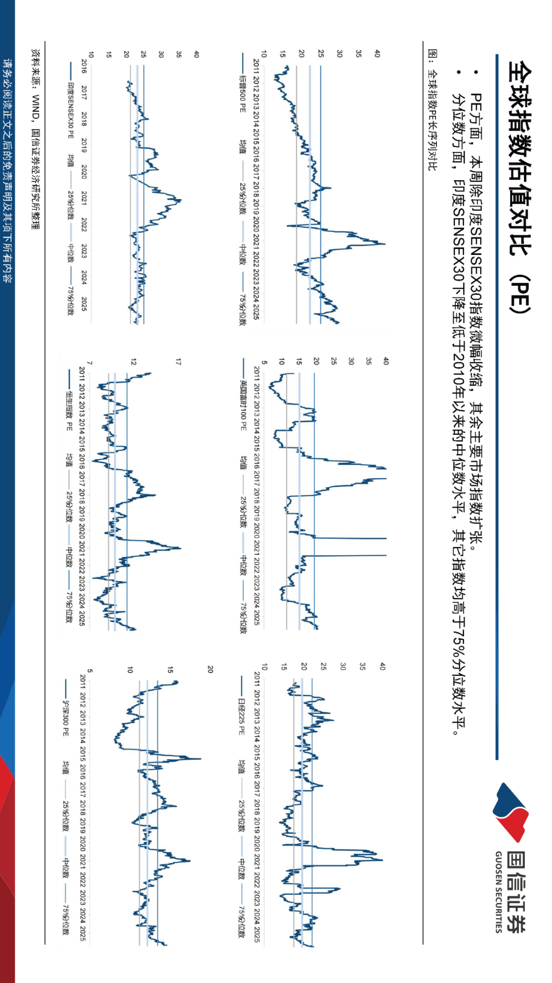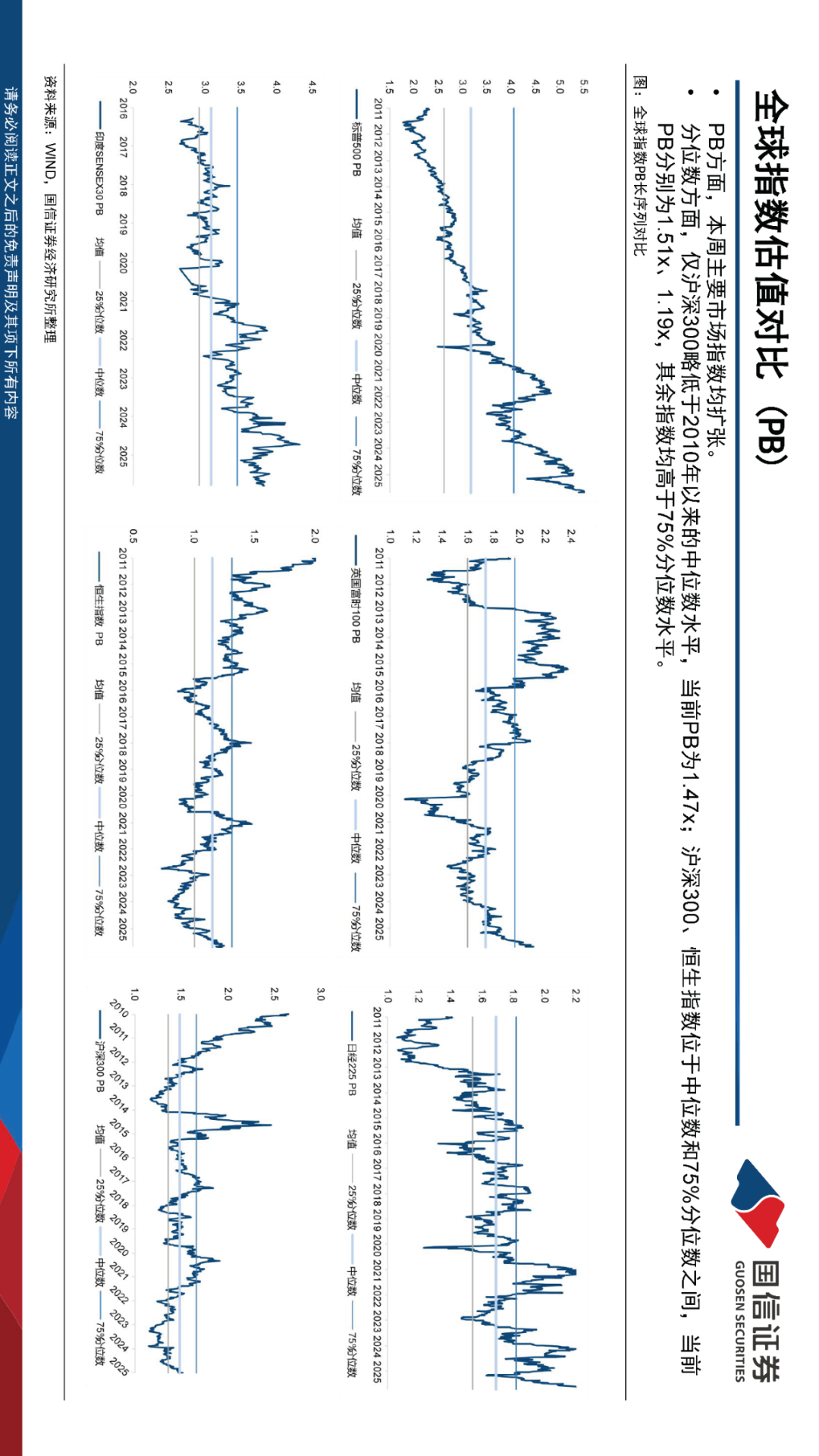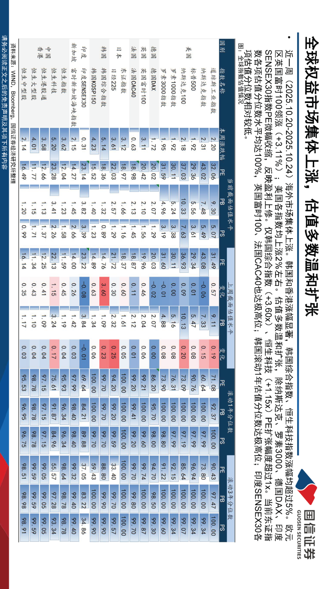 近一周(2025.10.20-2025.10.24)海外市场集体上涨,估值多数温和扩张。韩国和香港涨幅显著,韩国综合指数、恒生科技指数涨幅均超过5%。欧元区英国富时100领涨(+3.11%);美国各指数均上涨2%左右。估值多数温和扩张,除纳斯达克、罗素3000、德国DAX、印度SENSEX30指数PE微幅收缩,反映盈利上修。仅韩国综合指数(+3.60x)、恒生科技(+1.15x)PE扩张幅度超过1x。当前东证指数各项估值分位数水平均达100%,英国富时100、法国CAC40也达极高位;韩国滚动1年估值分位数达极高位;印度SENSEX30各项估值分位数相对较低。
