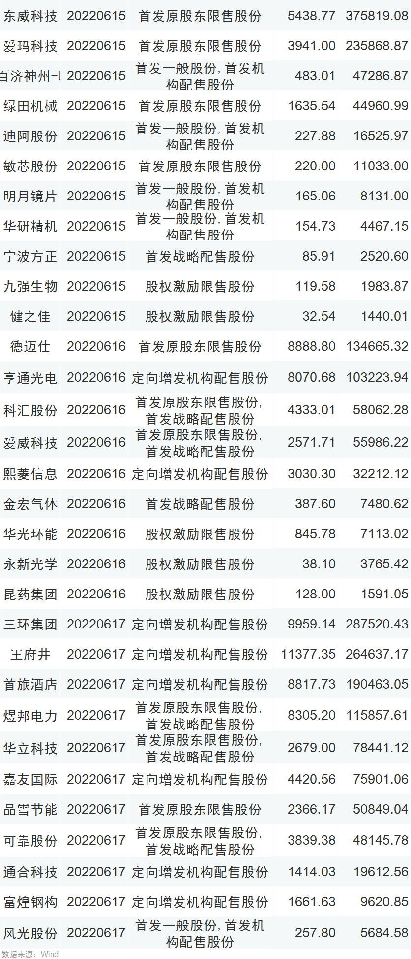 本周限售股解禁一览