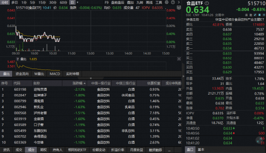 吃喝板块今日(9月18日)震荡回调,反映吃喝板块整体走势的食品ETF(515710)开盘走弱后持续低位震荡,截至发稿,场内价格跌0.63%。