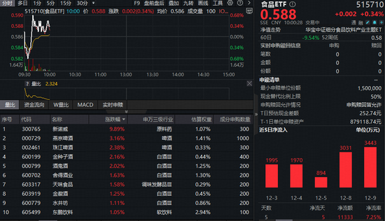 吃喝板块今日(12月10日)逆市拉升。反映吃喝板块整体走势的食品ETF(515710)开盘短暂下探后迅速拉升翻红,盘中场内价格最高涨幅达到0.68%,截至发稿,涨0.34%。