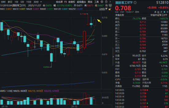 商业航天概念反复活跃,带动国防军工板块逆市拉升!高人气国防军工ETF(512810)场内收涨0.85%,收盘价创近一个月新高,立于所有均线上方,上升趋势或初步确立。持仓商业航天概念股强势,西部材料4天3板创历史新高,菲利华、中科星图大涨7%。