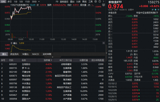 成份股方面,动保、生猪养殖、水产等板块部分个股涨幅居前。截至发稿,生物股份大涨超4%,罗牛山、天康生物双双涨超2%,梅花生物、开创国际、中水渔业等多股跟涨超1%。