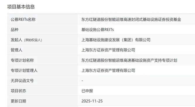 根据上交所网站信息,东方红隧道股份智能运维高速封闭式基础设施证券投资基金状态显示为“已申报”。