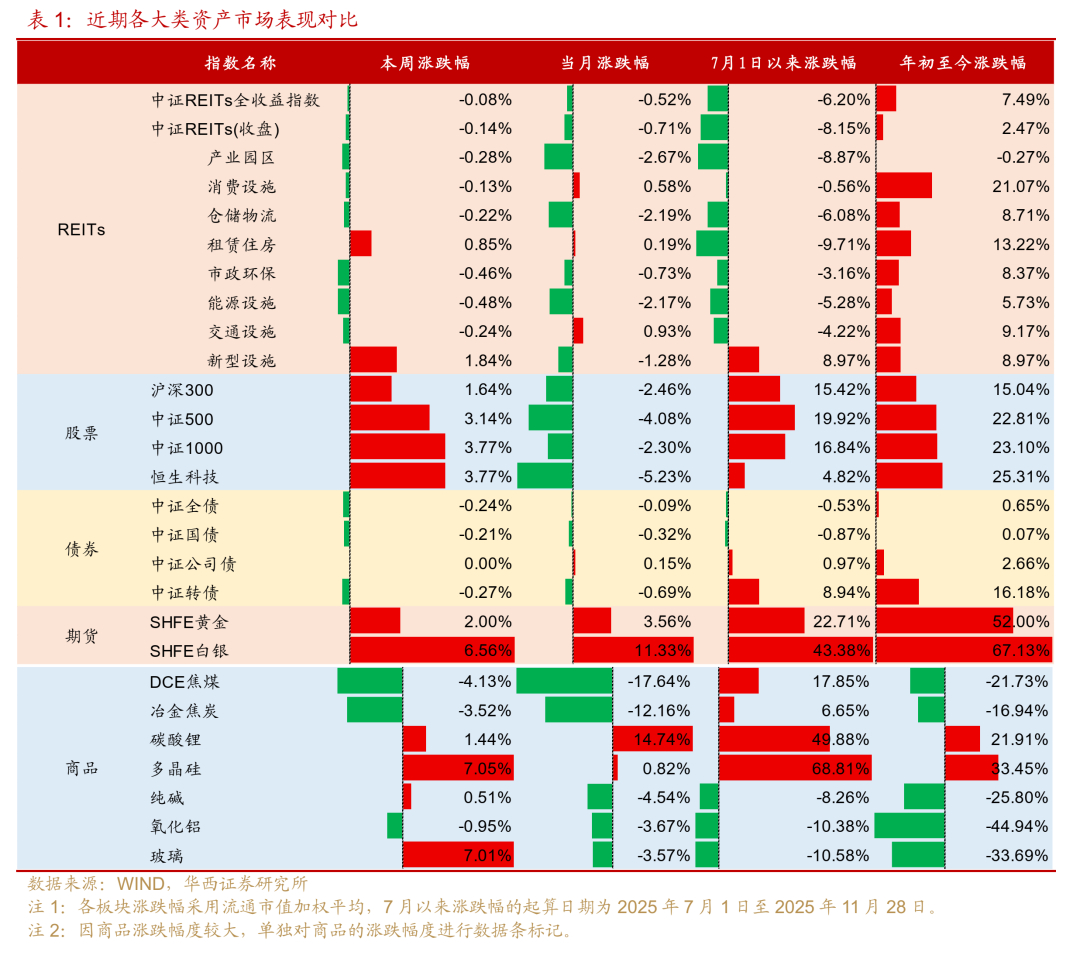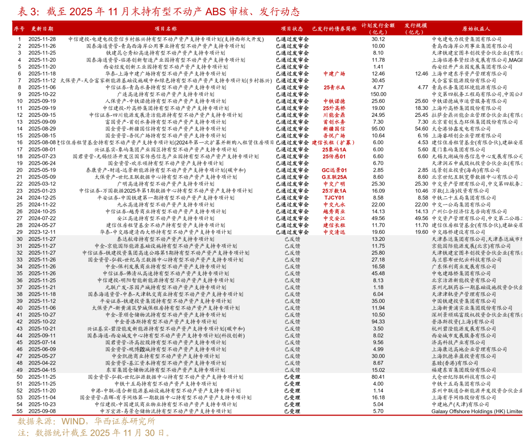 截至2025年11月28日,年内剩余潜在发行项目0-1单左右。具体来看:当前已发售待上市的有1单(华夏安博仓储物流2025-11-18基金合同生效),交易所已反馈8单(华夏中核清洁能源2025-11-21、山证晋中公投瑞阳供热2025-11-6、华夏湖北交投楚天高速2025-10-10、中航天虹消费2025-9-3、创金合信电子城产业园2025-7-2、建信建融家园租赁住房2024-4-15、华夏万纬仓储物流2024-4-15、建信金风新能源2023-10-22),交易所已受理3单(中航中核集团能源2025-11-25、东方红隧道股份智能运维高速2025-11-25、易方达广西北投高速2025-11-4),交易所已申报1单(平安西安高科产业园2025-11-25)。