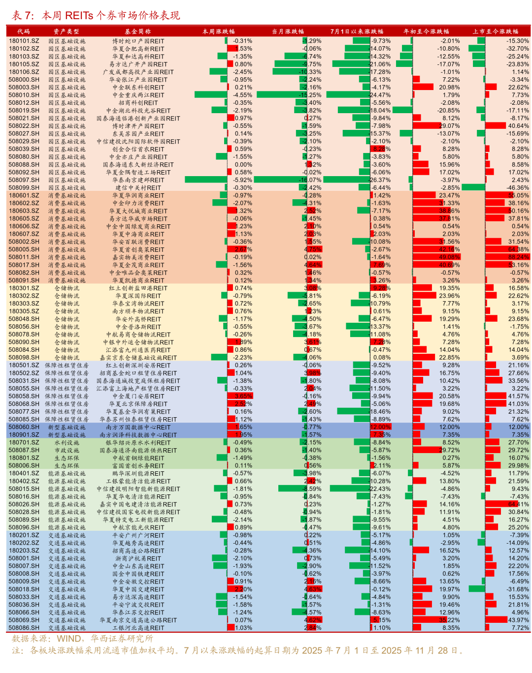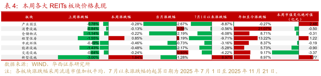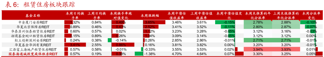 本周REITs整体下跌但幅度不大,仅数据中心、租赁住房板块上涨。全市场35收涨,1只收平,41只收跌,各细分资产个券涨跌互现。