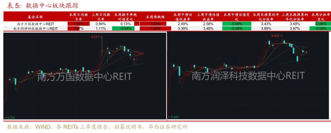 数据中心(IDC)板块上周受科技板块影响大幅下跌后,本周均强势反弹,润泽科技数据中心、万国数据中心分别上涨了1.95%、1.65%,动态分派率分别降至3.89%、3.43%,仍可根据科技板块行情走势进行操作。