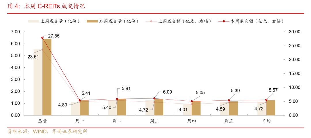 本周REITs成交活跃度边际走强,日均成交额5.57亿元、日均成交量1.28亿份、日均换手率0.49%,环比分别上升17.93%、12.33%、0.06pct。