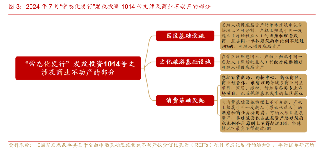 2024年7月常态化发行的1014号文仅明确了园区设施、文化旅游设施、消费基础设施配套的酒店和商业办公用房等可纳入底层资产,并对面积等做出了严格的限定。商业不动产REITs的推出,将直接适用于已产生持续、稳定现金流的商业项目,极大拓宽了盘活资产的空间。