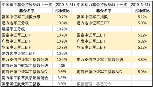 司令还是喜欢用数据来说话。经过2019年一季度末最新基金持仓数据整理发现,中船科技前海开源大海洋混合持有占净值比为8.01%,中国海防、久之洋、中国应急、中国船舶均无重仓持股占比超过5%以上的基金,只有中国重工和中国动力基金持仓占比较多。下表是基金持有这两只个股占净值比情况,从数据上可以看出:共有4只场外基金持有占净值比超过15%以上,分别是富国中证军工分级、易方达军工分级、申万菱信中证军工指数分级、前海开源中证军工指数A(也有C类);共有3只场内ETF基金持有占净值比超过15%以上,分别是国泰中证军工ETF、广发中证军工ETF、华宝中证军工ETF。