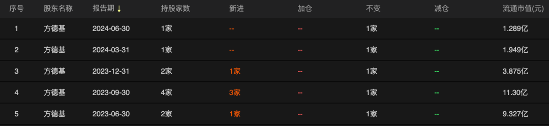 随后在2024年6月30日之后,方德基在资本市场上开始“隐身”,至今再也没有出现在任何A股公司的前十大流通股东上,而在2023年第三季报时,方德基当时持股市值达11.30亿元。