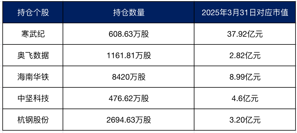 数据显示,除了持仓寒武纪外,在今年A股公司披露的一季报中,章建平还同时持仓奥飞数据、海南华铁、中坚科技、杭钢股份,五只个股合计持股市值高达57.53亿元,持仓个股均涉及人工智能概念。