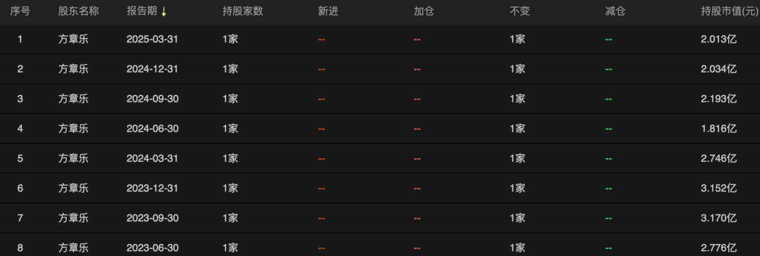 同样变得低调的还有章建平的妻子方文艳,其在2024年、2023年的持股金额均在10亿元以上,曾大举建仓江淮汽车、长安汽车、鸣志电器等个股,而到了今年的一季度末,方文艳的持股金额仅为1.85亿元,仅持有海利生物2699万股。
