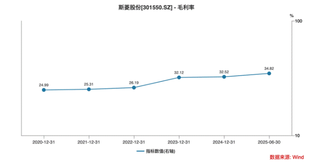 2020‑2024年,斯菱股份得益于下游需求稳步增长,营收从5.25亿元增至7.74亿元,年均复合增速10.2%;同时,由于产品结构优化叠加扎根轮毂轴承海外售后市场,实现市场拓展,公司毛利率不断提升,由2020年的24.99%连续增至2024年的32.52%。