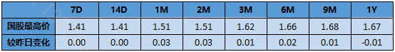 今日存单总体成交清淡,全天各期限成交小幅波动。1y大行 早盘成交1.665%,下午情绪未见好转在1.6675%位置成交。全期限来看国股成交,10月底到期1.44;明年1月底到期1.59;明年4月底到期1.6425;明年7月底到期1.67;明年9月底到期1.665。