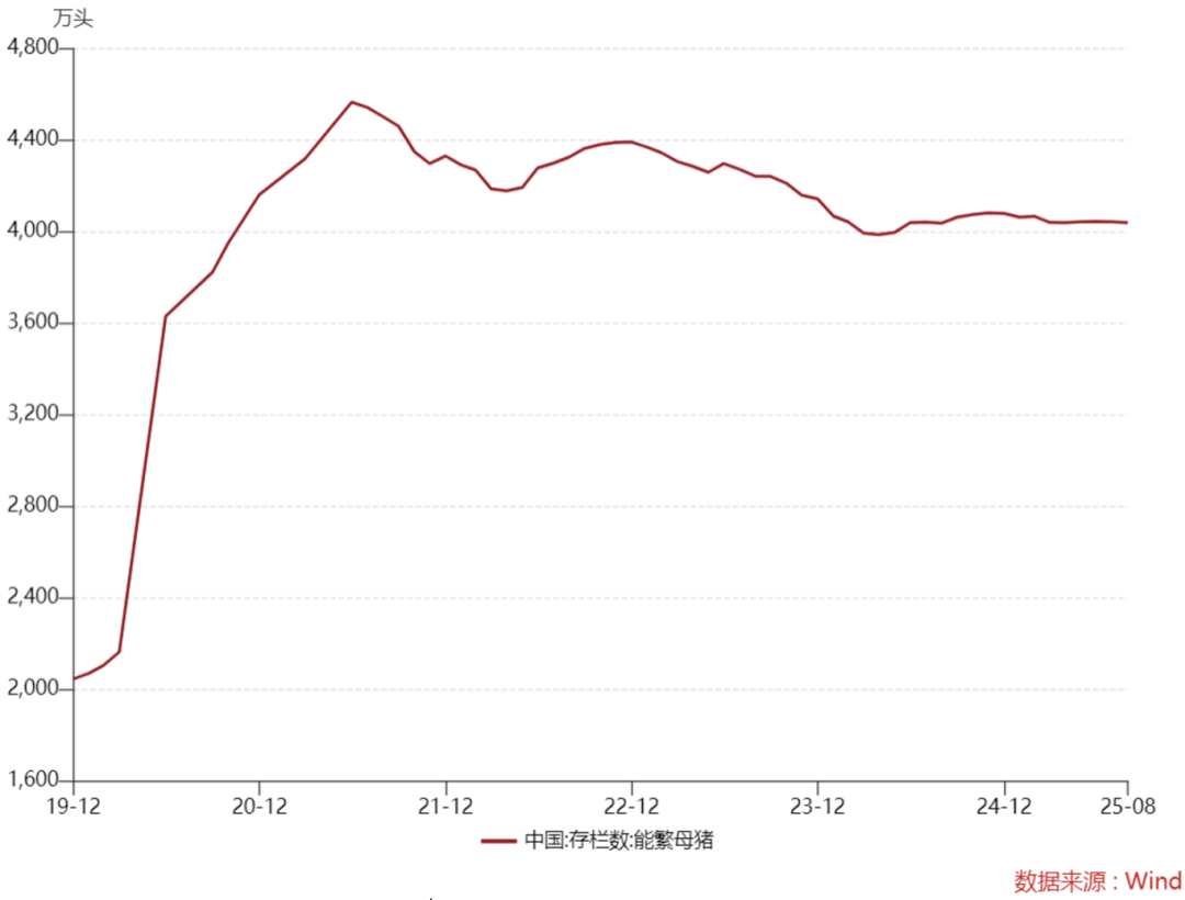 行业供给方面,接近三年的产能出清是2024年猪价上涨的基础,2024年下半年产能去化节奏出现反复,但近期数据已经重回下降通道。猪肉价格的影响因素中,需求侧较为刚性,而供给侧弹性更大。根据农业农村部数据显示,2024年4月,能繁母猪存栏数量为3986万头,较21年6月份的存栏高点(4390万头)下降约10%。但进入2024下半年,能繁母猪的去化周期略有反复,截止2025年8月,能繁母猪存栏量下降至4038万头。行业供给产能重新进入了去化区间。