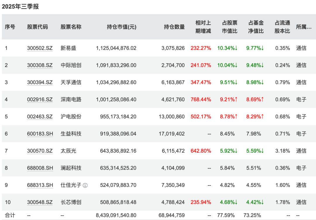 季报显示,该基金规模如今已经超过115亿元,是年中的近10倍。同时,该基金在三季度内新增了3只重仓股:分别是生益科技、澜起科技、仕佳光子,这几只股票的年内收益分别达到了156%、102%、328%(截至2025年10月22日早盘,下同)。