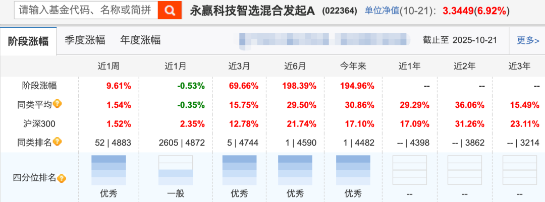 截至10月21日,永赢科技智选混合基金(后简称“永赢科技基金”)年内收益率达到了198.4%(下图),这支冠军基金日前披露了三季报。