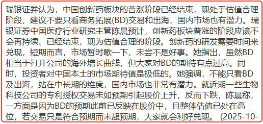 瑞银认为,东大创新药的“普涨阶段已经结束”,现在估值合理,现在不能只看BD出海了,要看国内市场了。