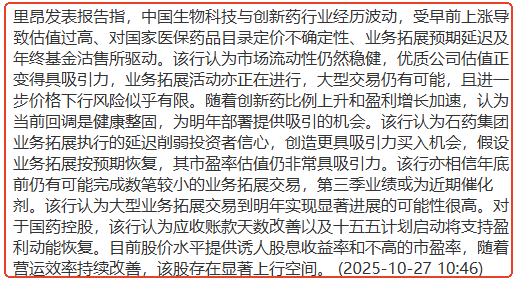里昂认为,估值过高、医保不确定性、业务拓展延迟、年终基金派发是影响因素,调整后还是香的。