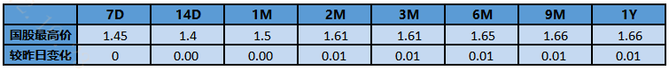 今日存单交易情绪清淡,利率基本无波动。全期限来看国股成交,明年2月底到期1.57;明年5月底到期1.61;明年8月底到期1.63;明年11月底到期1.635。