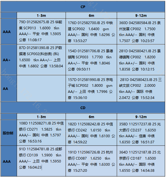 25合肥科技农商行债01 09:00-18:00 合计发行30亿元 3Y AA+/AA+ 无担保 中信证券,华泰证券,中信建投证券,中金公司,招商证券,申万宏源证券 1.6-2.6