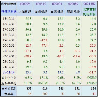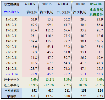 从近十年营收复利增长率看,海南机场最大为13.1%;北京首都机场最小为-4.0%。