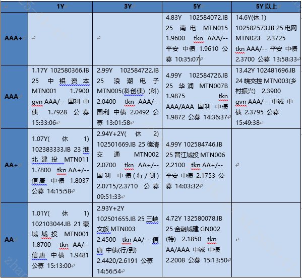 25三峡银行绿色债01B 09:00-18:00 合计发行10亿元 3Y AA+/AA+ 无担保 中信证券,国泰海通,中金公司,国开证券,西南证券,长江证券,重庆银行,首创证券,兴业银行,中国邮政储蓄银行 1.8-2.4