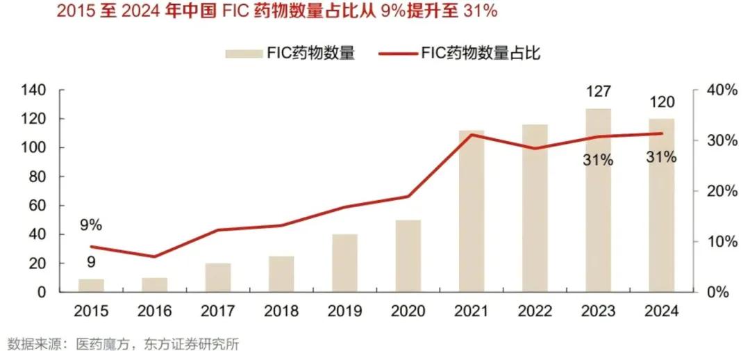 这种悬殊的产生一是来源于国内获批加速度,使在研创新药井喷至全球第二;二则是FIC(首创药或同类首创药)不足。