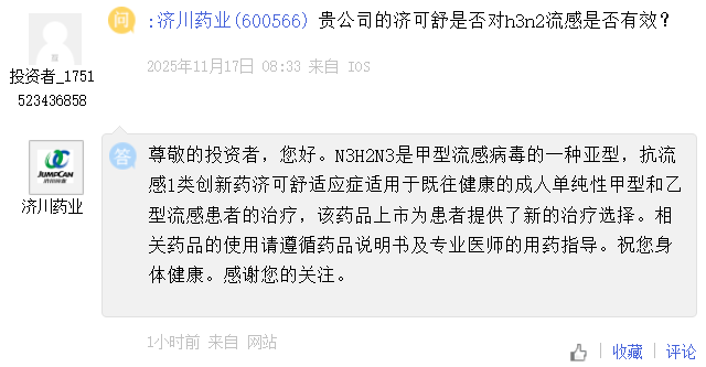 济川药业 [600566] :N3H2N3是甲型流感病毒的一种亚型,抗流感1类创新药济可舒适应症适用于既往健康的成人单纯性甲型和乙型流感患者的治疗,该药品上市为患者提供了新的治疗选择。