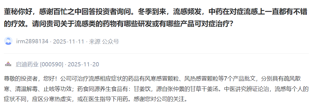 启迪药业 [000590] :公司可治疗流感相应症状的药品有风寒感冒颗粒、风热感冒颗粒等7个产品批文,分别具有疏风散寒、清温解毒、止咳等功效;药食同源养生食品有:甘姜饮,源自张仲景的甘草干姜汤。中医讲究辨证论治,流感每个人的症状不同,应区分寒热虚实,或在医生指导下用药。